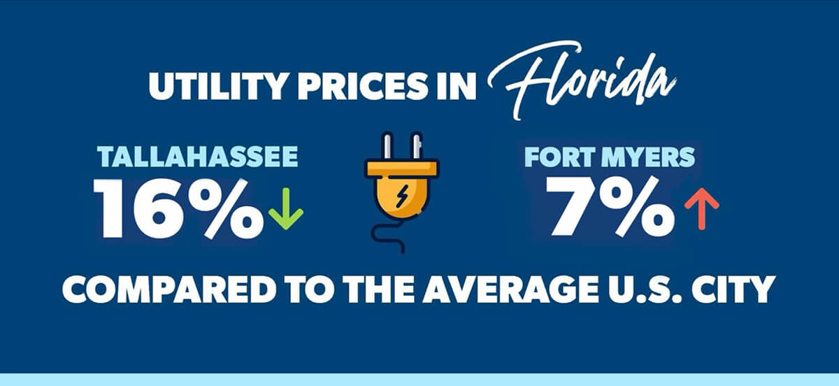 Utility costs like energy and phone use in Florida range from 16% lower than the national average in Tallahassee to 7% higher in Fort Myers. Daytona Beach is somewhere in the middle range among Florida cities for utility costs.